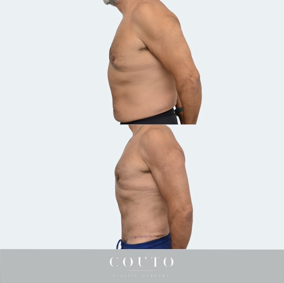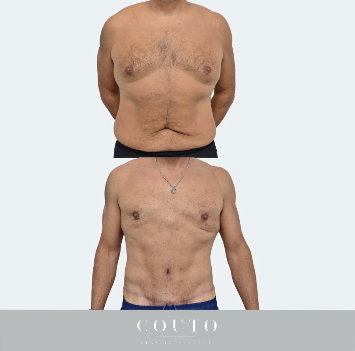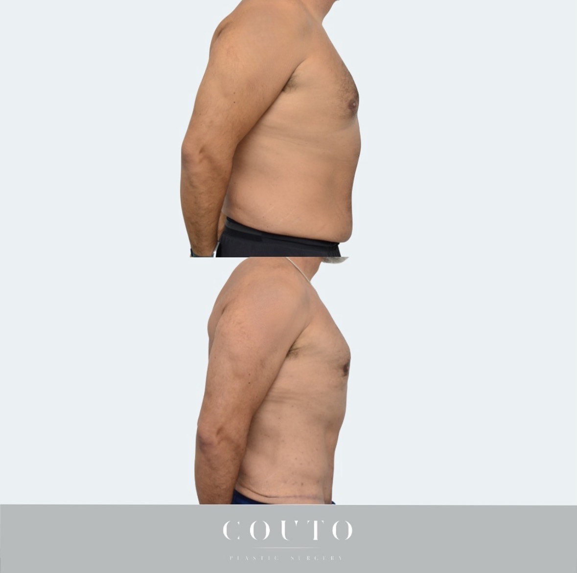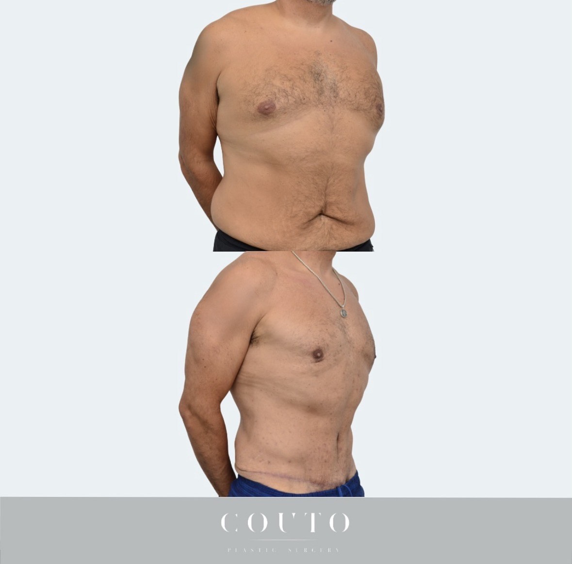 Brindamos a nuestros pacientes un protocolo postoperatorio detallado para garantizar que tengan una recuperación cómoda y rápida. Después de la cirugía, al paciente se le pueden colocar tubos de drenaje, lo que ayuda a prevenir la acumulación de líquido en el abdomen y acelera la recuperación. Por lo general, se eliminan 1 semana después de la cirugía. Al paciente también se le colocará una prenda de compresión especializada que ayuda a minimizar la hinchazón y a mantener el contorno del cuerpo. Es de esperar hinchazón y hematomas, las mismas pueden notarse durante varias semanas. Para minimizar la hinchazón y la inflamación orientamos a nuestros pacientes que se sometan a masajes de drenaje linfático. Es común sentir dolor y sensibilidad alrededor del sitio quirúrgico; sin embargo, esto se controla fácilmente con un protocolo individualizado de medicación para el dolor posoperatorio proporcionado por el Dr. Couto. Normalmente recomendamos a nuestros pacientes que se tomen 10 días libres del trabajo (menos si trabajan desde casa). El mismo día después de la cirugía, el Dr. Couto siempre le indica al paciente que dé un par de vueltas caminando por la casa o el vecindario. Los pacientes pueden reanudar sus ejercicios aeróbicos (p. ej., correr, girar, andar en bicicleta) 2 semanas después de la cirugía y ejercicios de fortalecimiento/abdominales 8 a 12 semanas después de la cirugía. Puede tomar de 3 a 6 meses para que la hinchazón desaparezca por completo y vea los resultados finales.